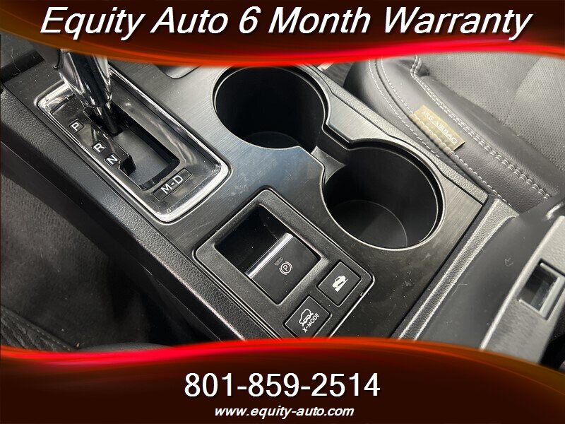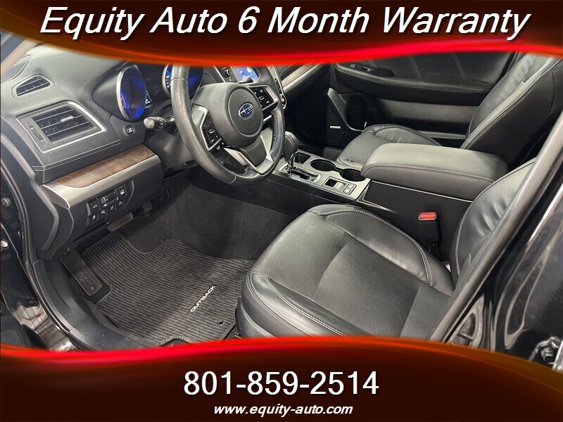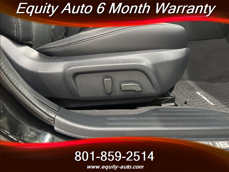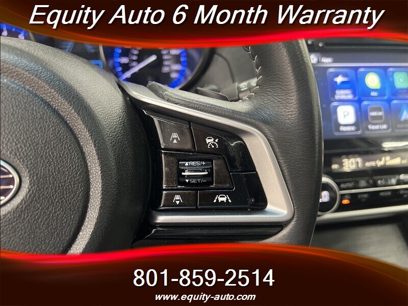 Standard features include leather upholstery, heated front and rear seats, a power-adjustable driver's seat, dual-zone automatic climate control, a touchscreen infotainment system with Apple CarPlay and Android Auto compatibility, Bluetooth connectivity, a rearview camera, and Subaru's EyeSight driver assistance suite with adaptive cruise control, lane departure warning, and pre-collision braking.
